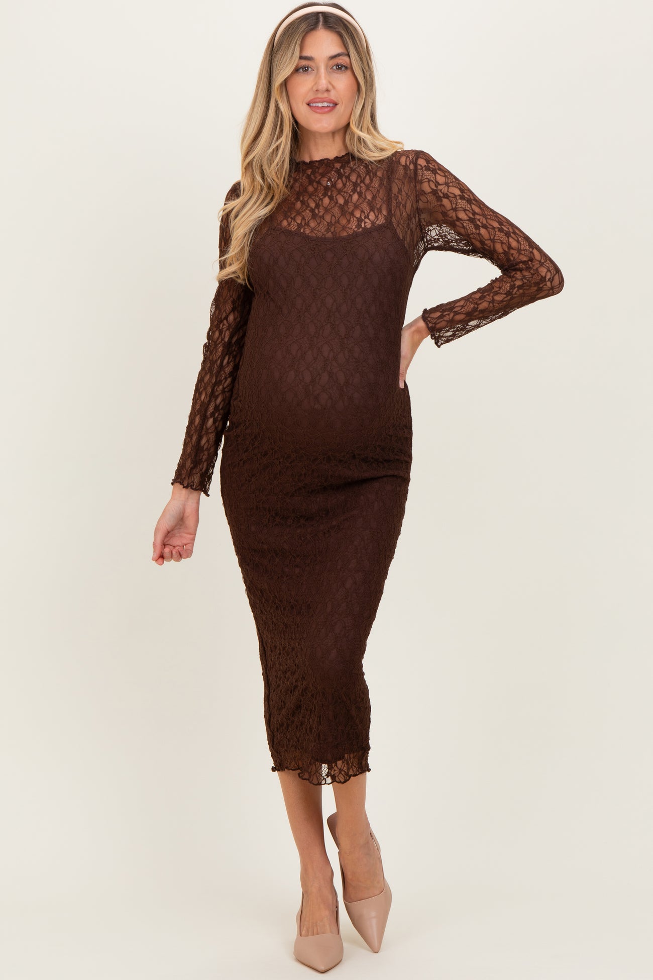 Brown Lace Overlay Fitted Maternity Midi Dress