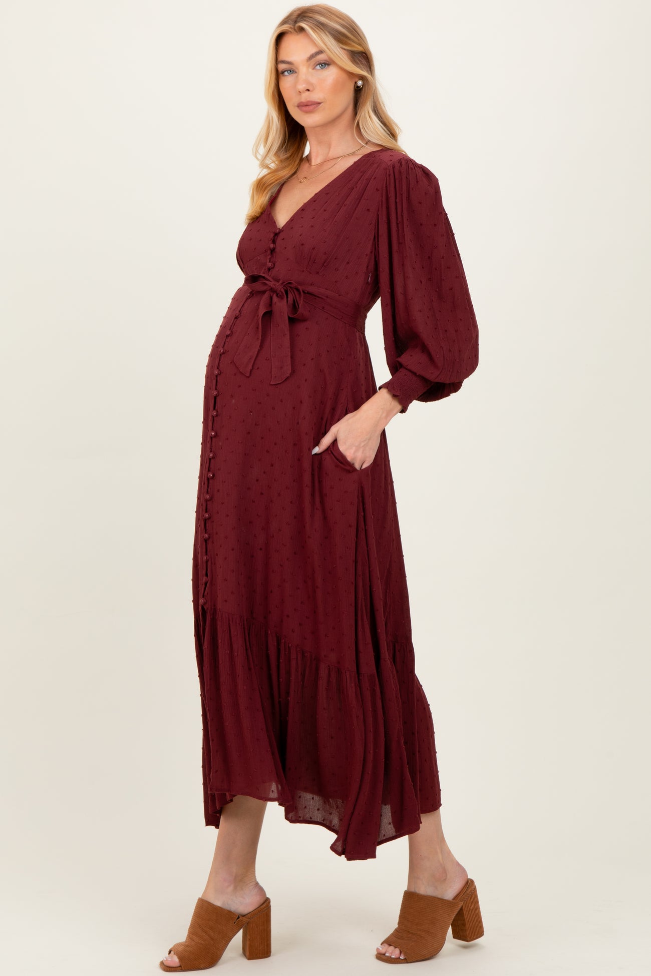 Burgundy Swiss Dot Button Down Maternity Maxi Dress