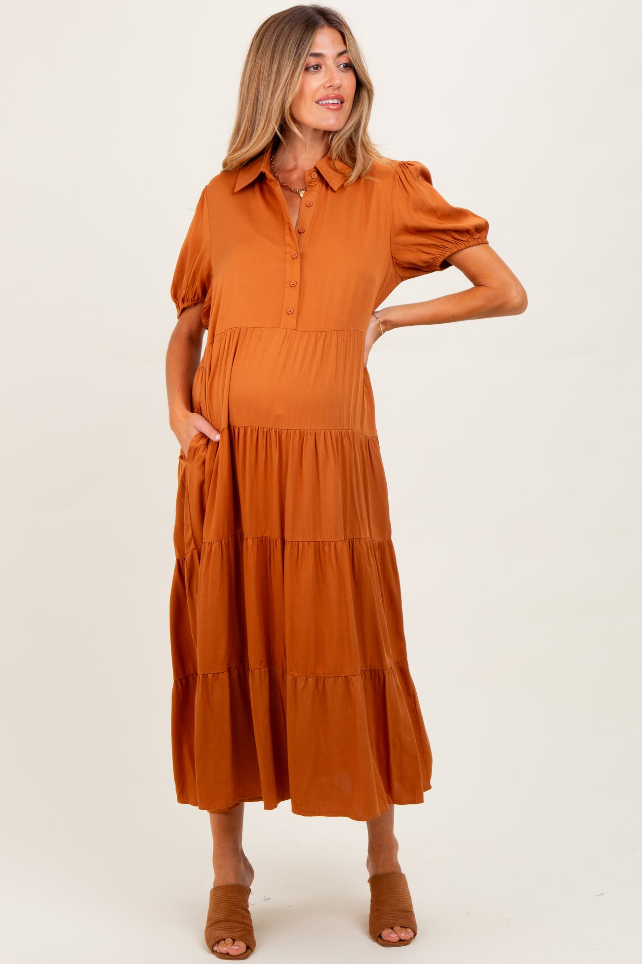 Camel Collared Button Down Tiered Maternity Midi Dress