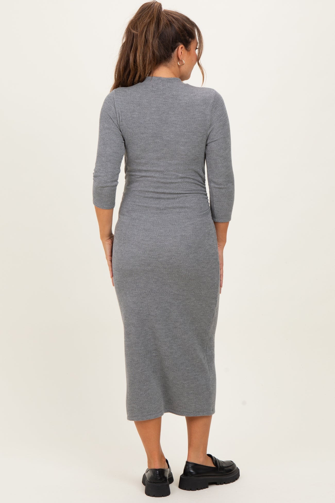 Charcoal Ribbed Knit Mock Neck Long Sleeve Ruched Maternity Dress