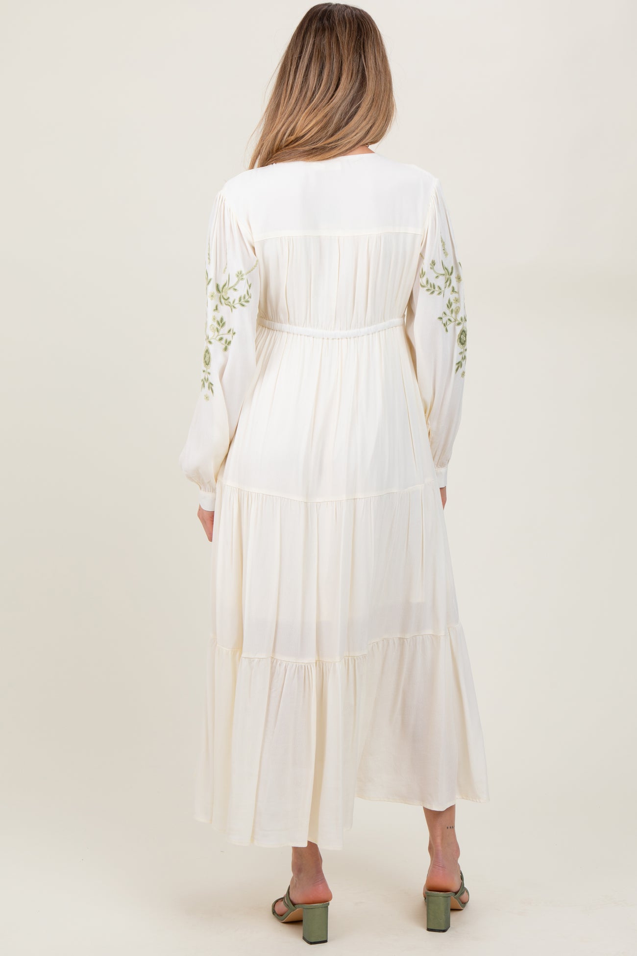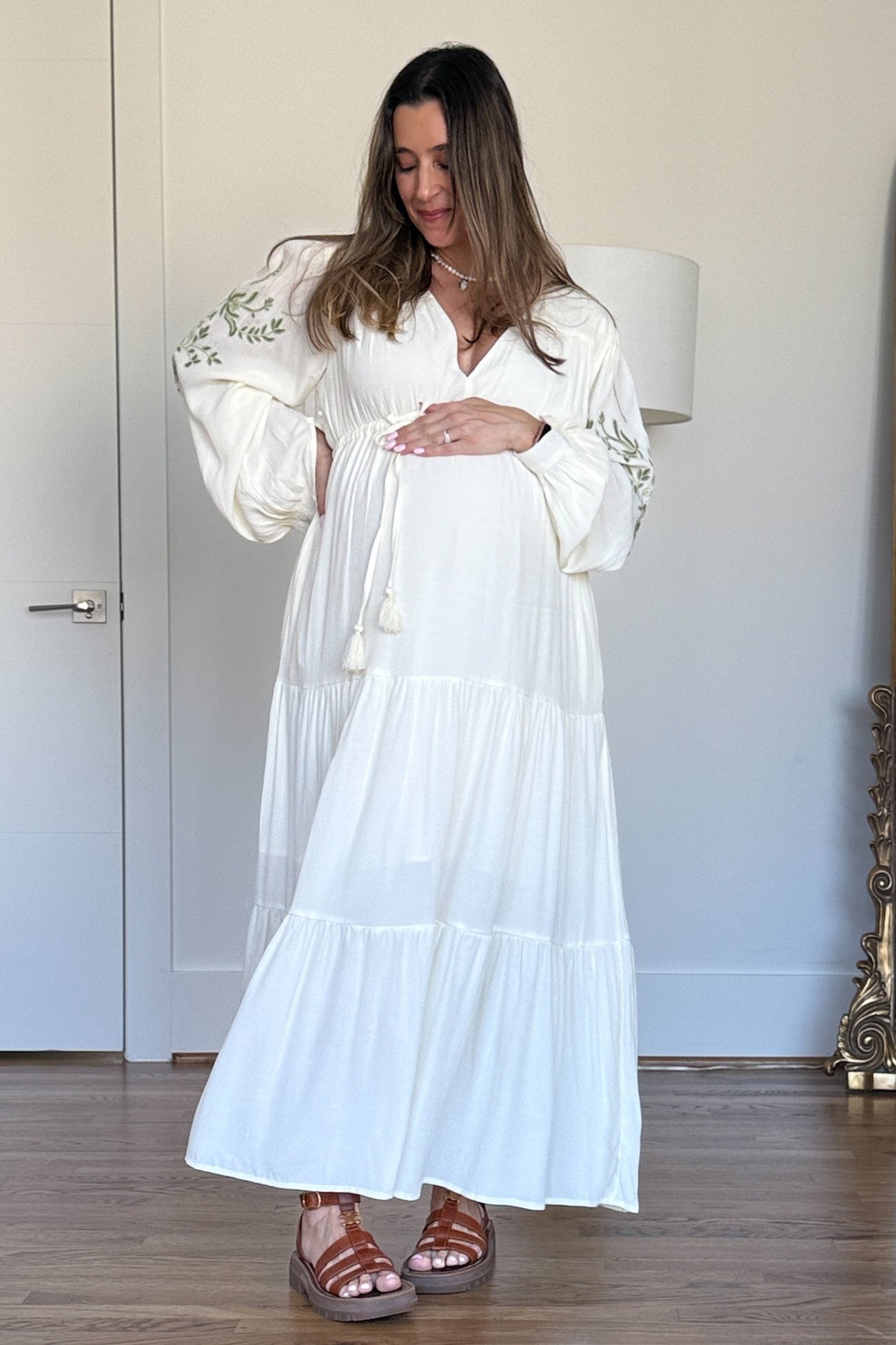 Cream Embroidered Long Sleeve Maternity Maxi Dress