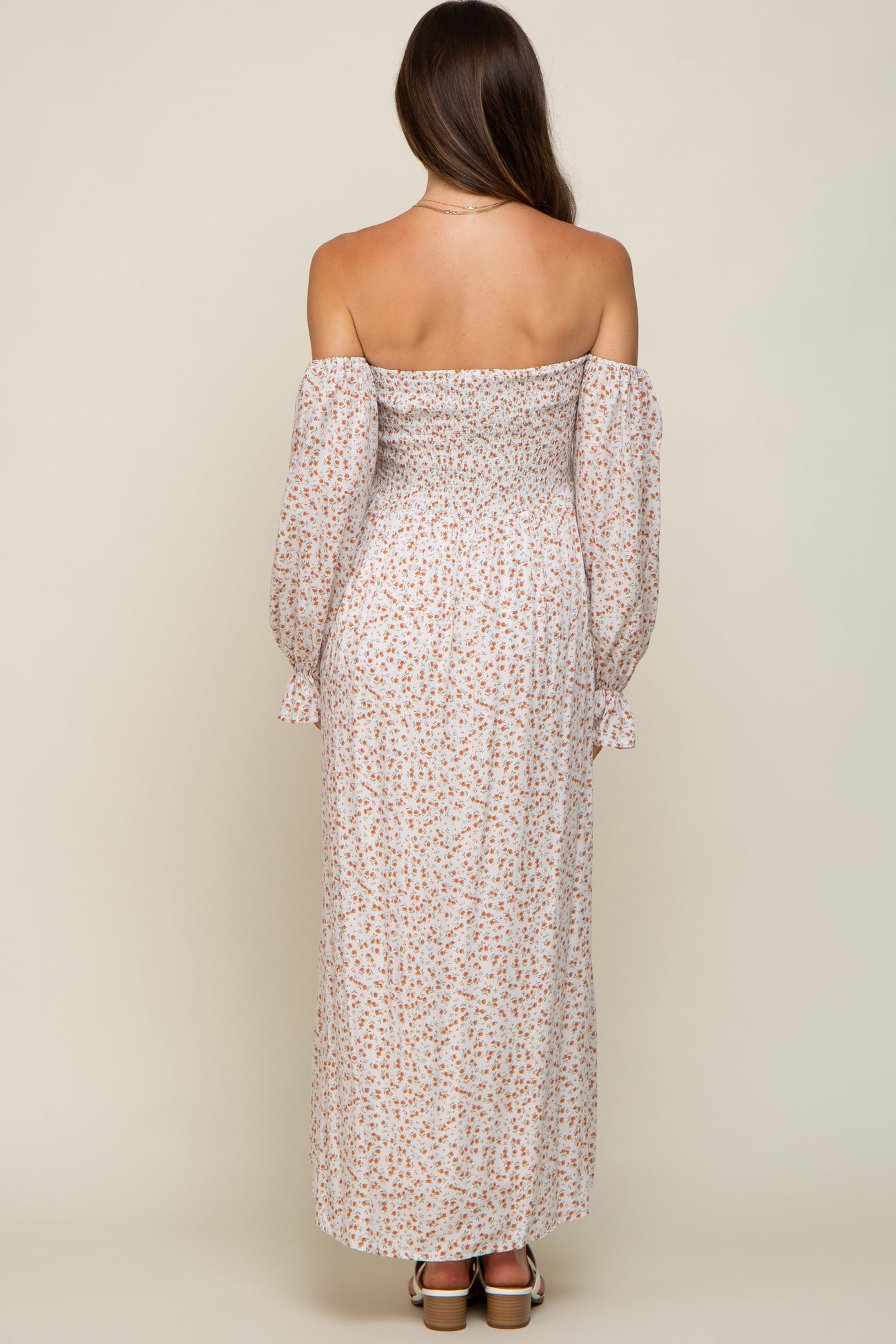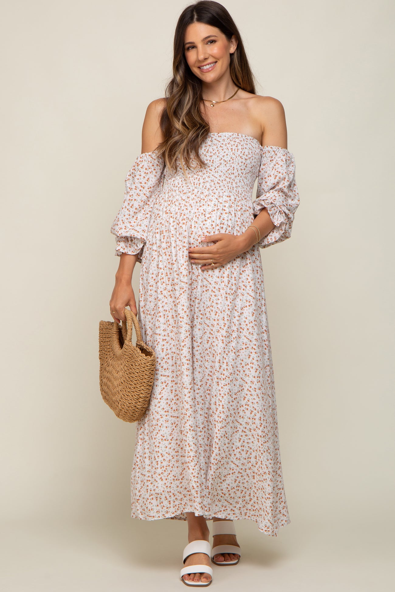 Cream Floral Square Neck Smocked Long Sleeve Maternity Maxi Dress