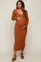 A solid hued fitted maternity maxi dress featuring long sleeves and a v-neckline.