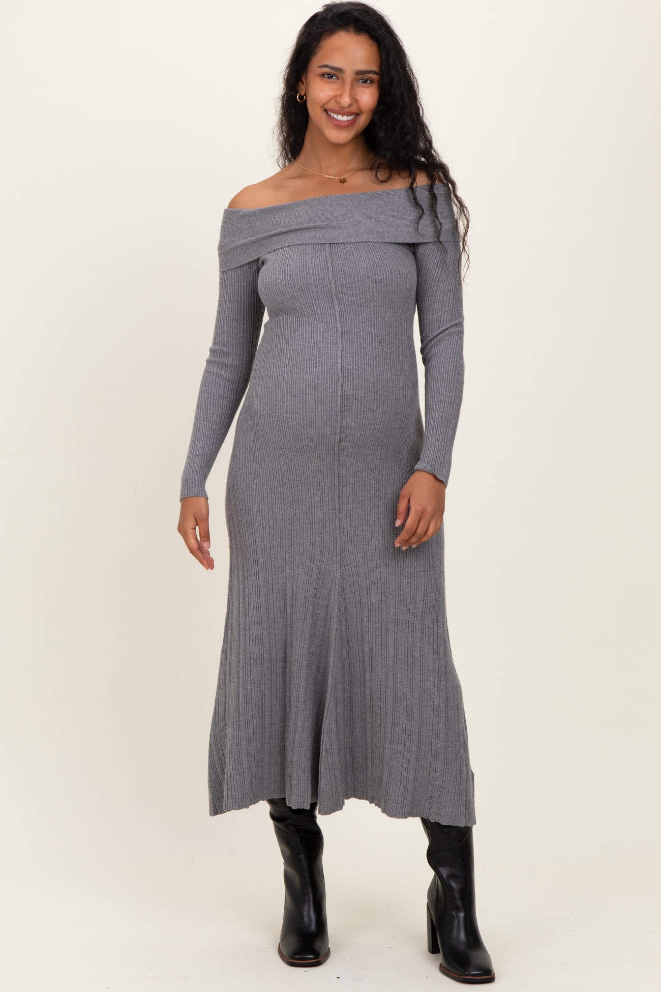 Elevate your maternity wardrobe with our Heather Grey Ribbed Knit Off Shoulder Maternity Midi Dress. Crafted from a soft, stretchy ribbed knit fabric, this dress gently hugs your growing bump while offering unmatched comfort. The elegant off-shoulder neckline adds a touch of sophistication, perfect for both casual days and special occasions. Featuring long sleeves and a flattering midi length, it pairs effortlessly with boots or flats. Designed to move with you through every trimester, this dress is a stylish and cozy essential for expecting moms who want to feel confident and chic. Machine washable for easy care.