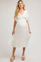 A solid maternity dress with a v-neckline, smocked elastic bust, and ruffle accents. Double lined.