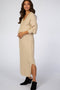 A solid hued fitted maternity maxi dress featuring long sleeves and a v-neckline.