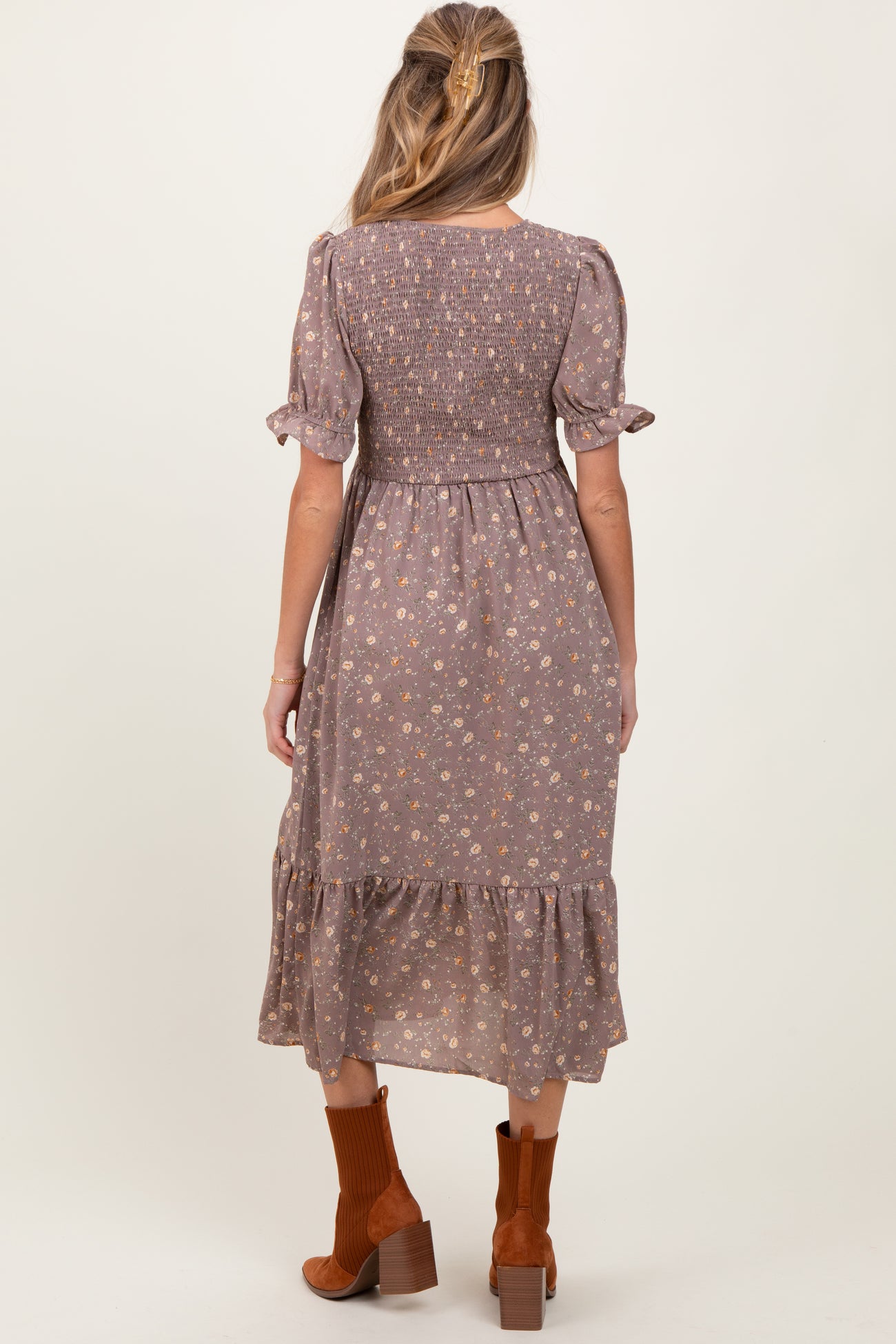 Mauve Floral Print Smocked Ruffle Hem Maternity Midi Dress