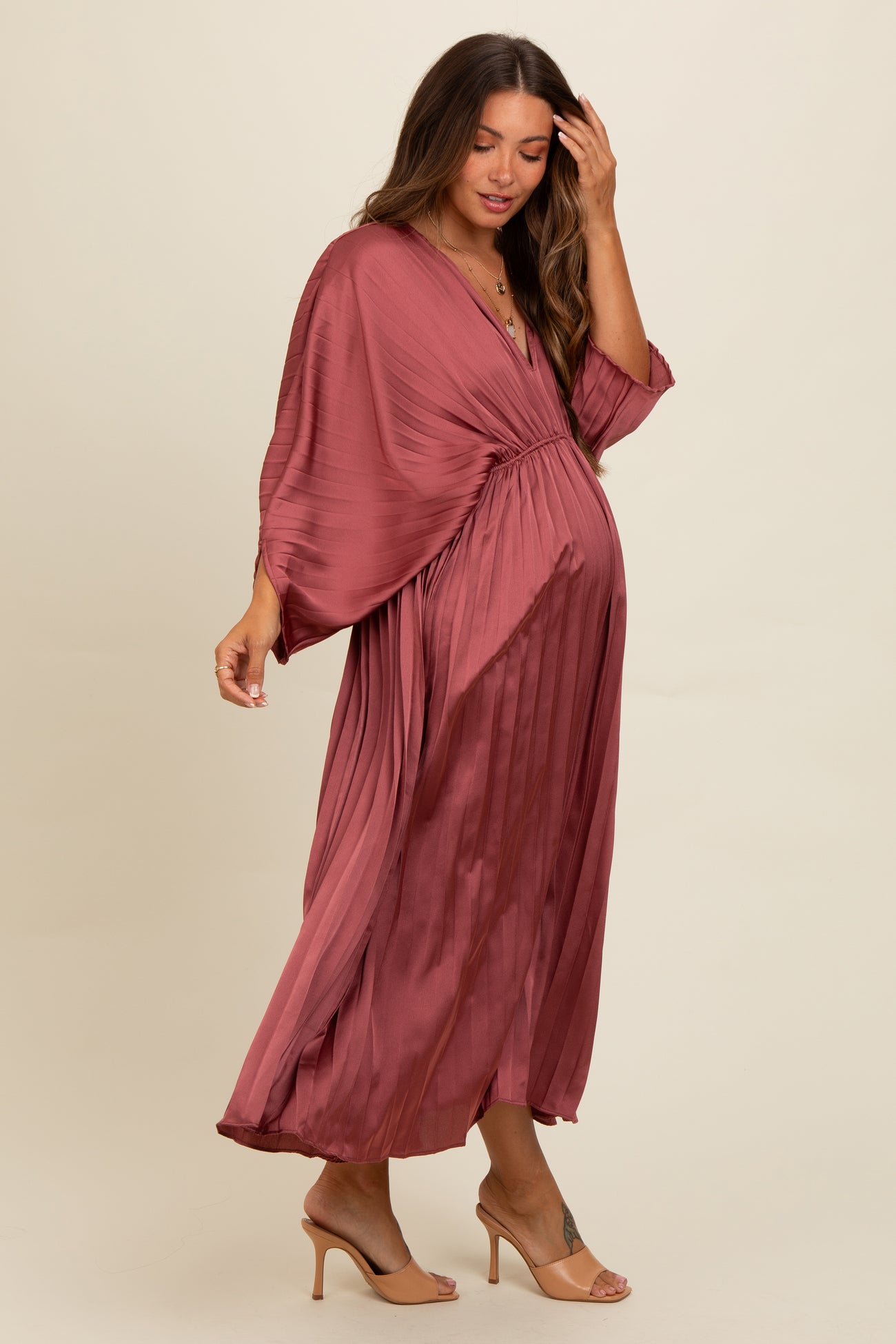 Mauve Satin Pleated V-Neck Maternity Maxi Dress