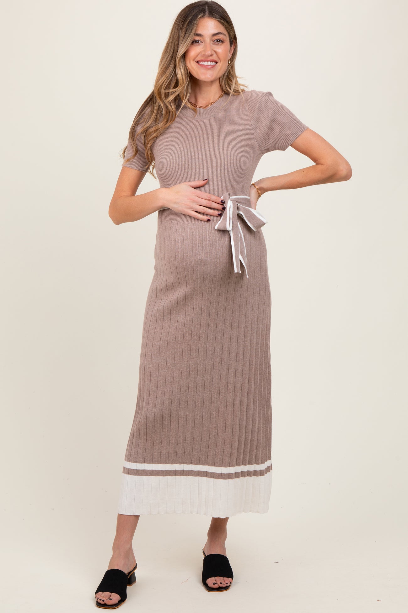 Mocha Ribbed Knit Pleated Maternity Midi Dress