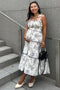 A solid hued maternity midi dress featuring short balloon sleeves, a self-tie split neckline and a ruffle hem.