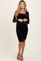 Navy Blue Velvet Long Sleeve Ruched Maternity Midi Dress