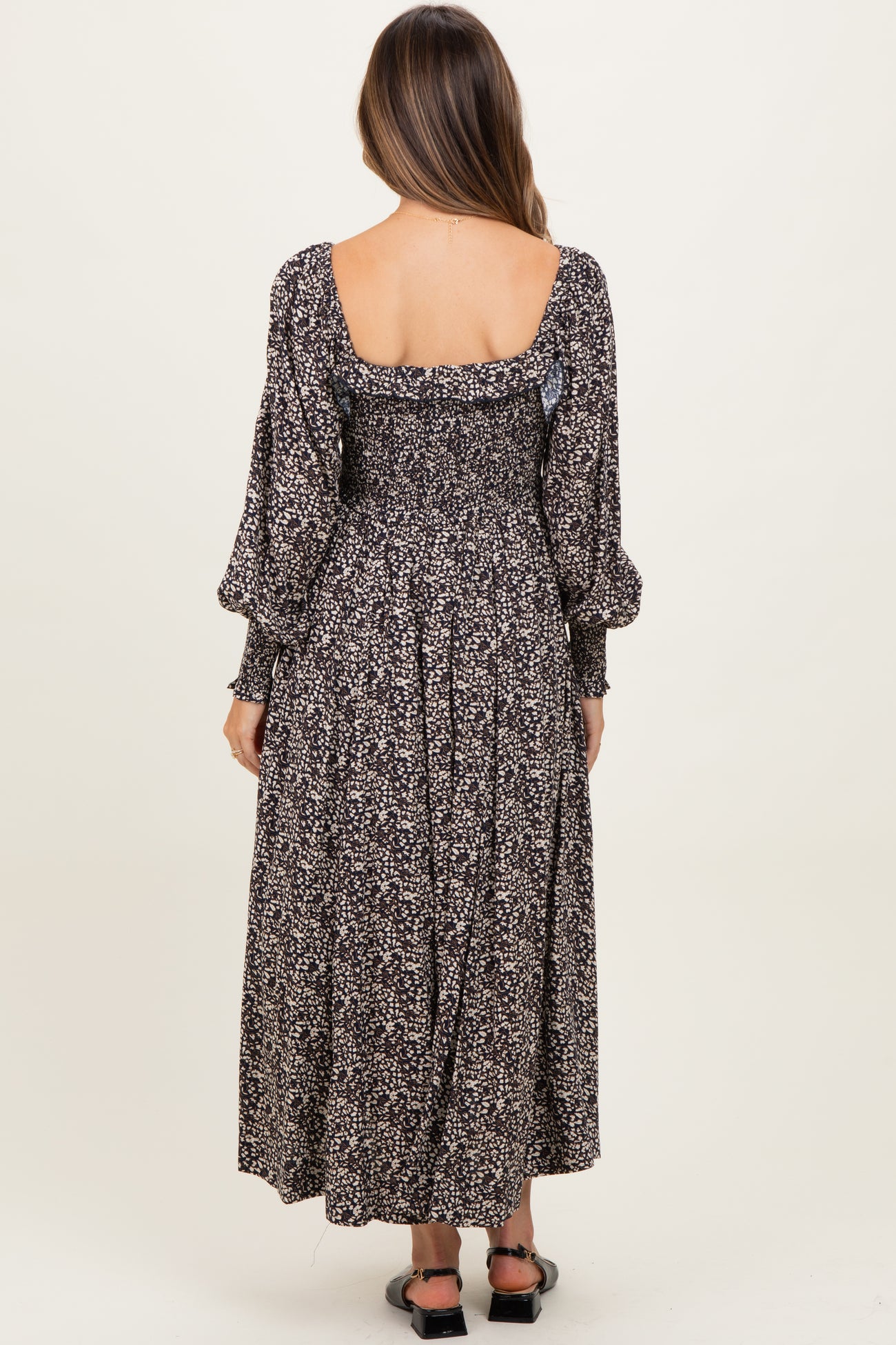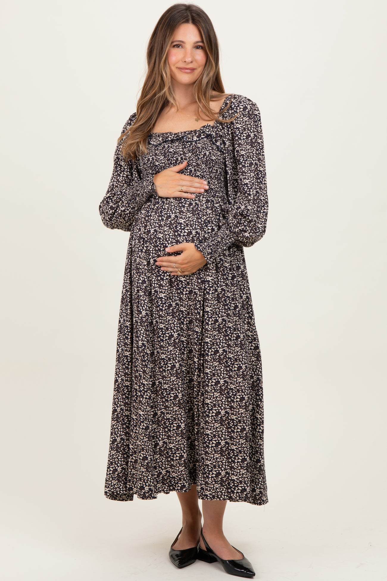 Navy Smocked Ruffled Floral Maternity Maxi Dress