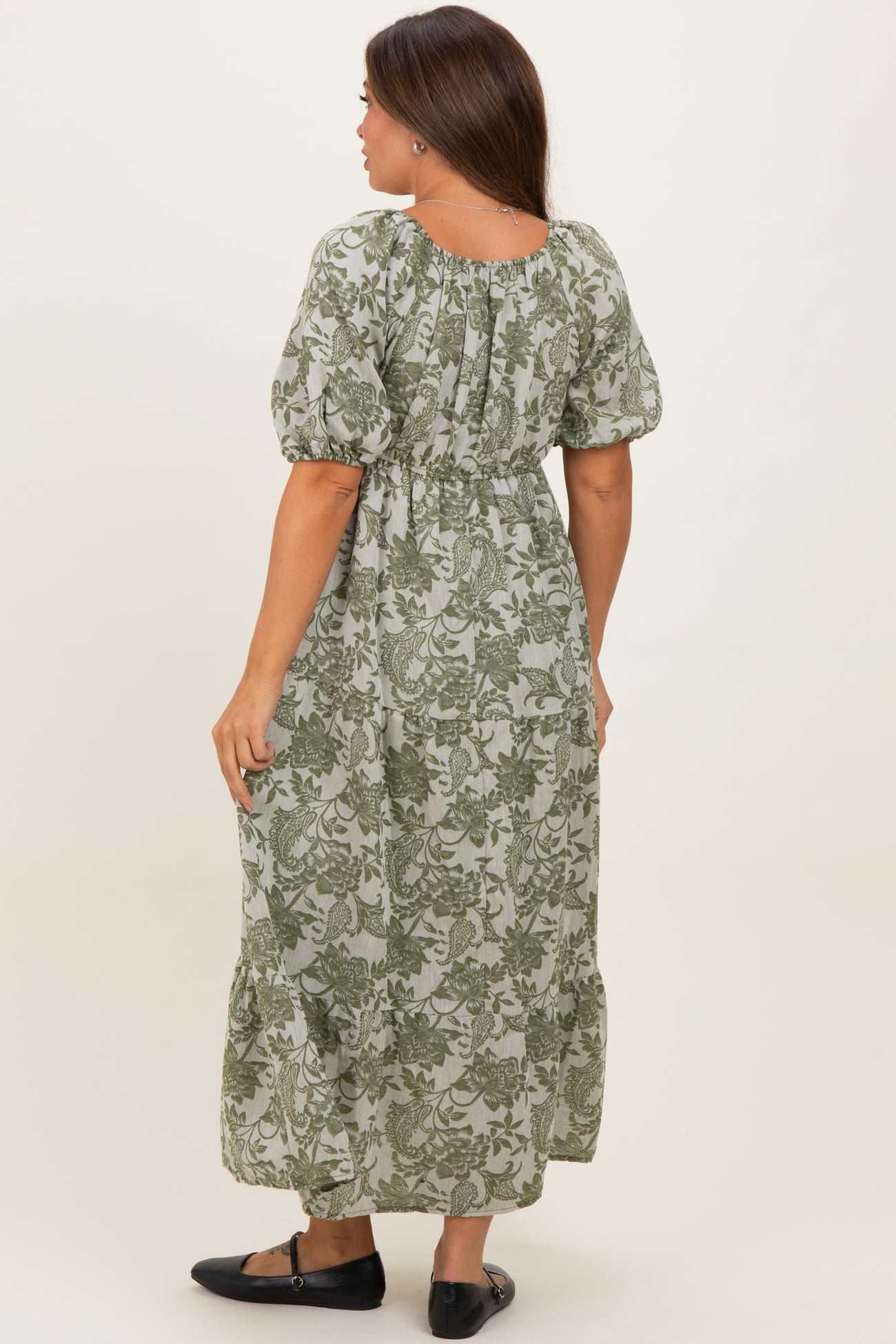 Olive Floral V-Neck 3/4 Sleeve Maternity Midi Dress