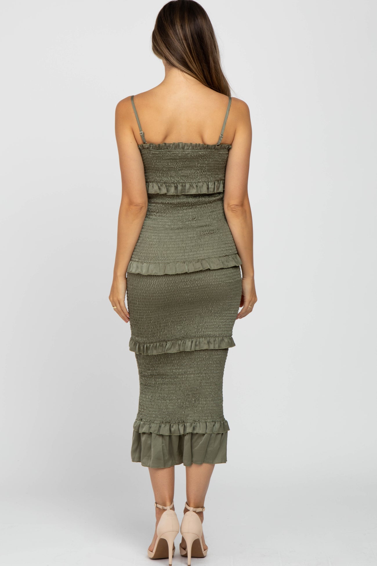 Olive Satin Smocked Fitted Maternity Midi Dress
