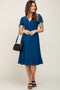 A solid short sleeve maternity midi dress. Features crossover neckline, cinched short sleeves, and ruffle hem. Pocketed.