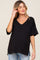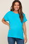 A solid maternity top featuring a front pocket, short sleeves, a v-neckline and side slits.