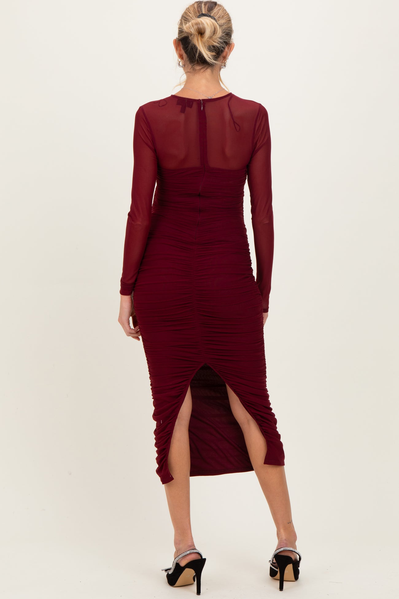 Burgundy Mesh Ruched Long Sleeve Maternity Midi Dress