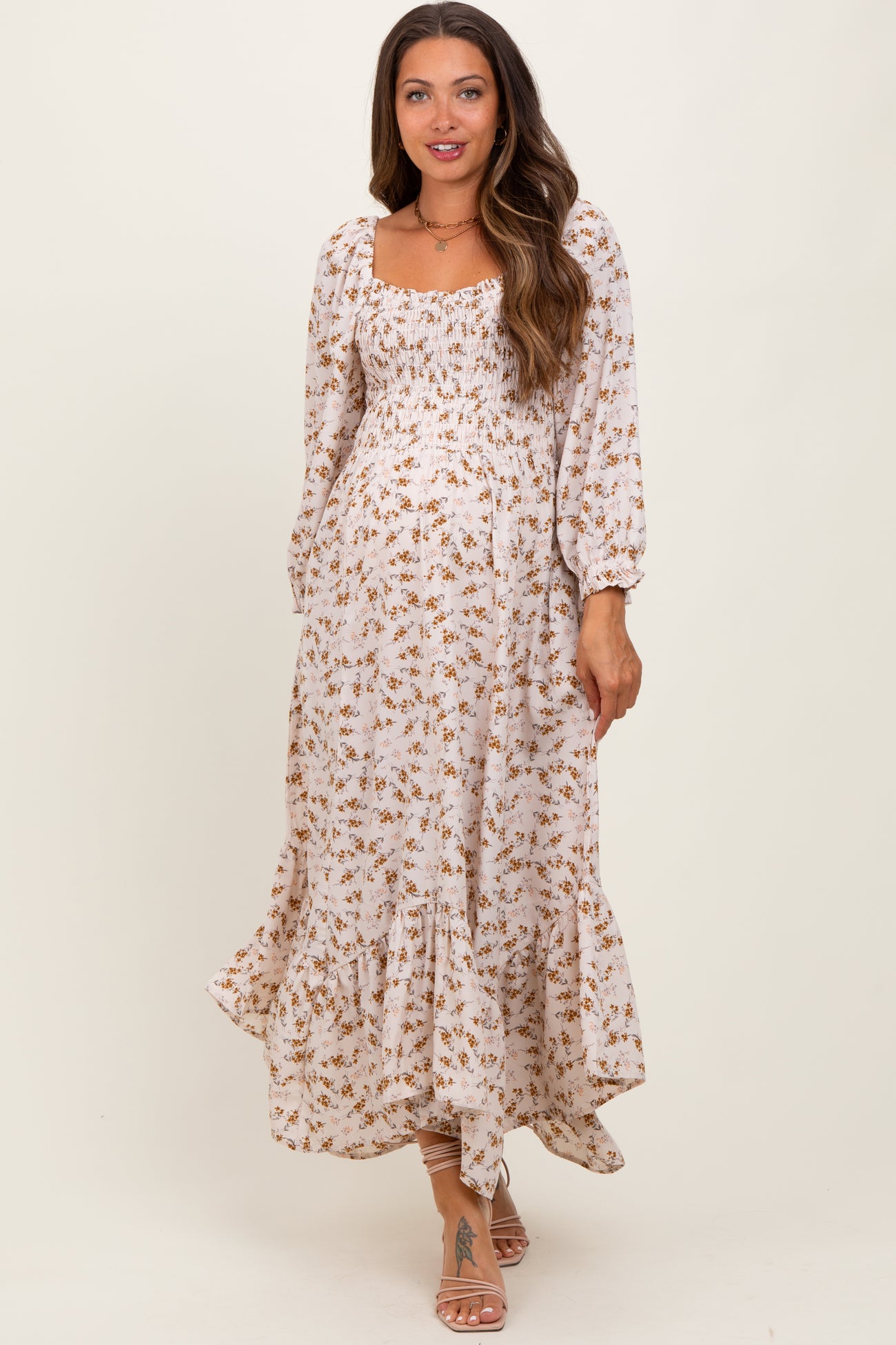 Ivory Floral Smocked Handkerchief Hem Maternity Maxi Dress