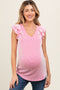 A floral sleeveless maternity dress featuring knotted shoulder straps, a wrap v-neckline, and an empire waist. Skirt is double lined.