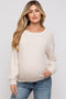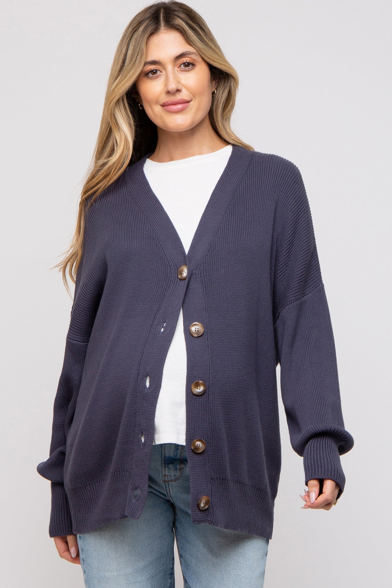 A basic ribbed knit maternity cardigan with long drop shoulder sleeves, a v-neckline, and front functioning buttons.