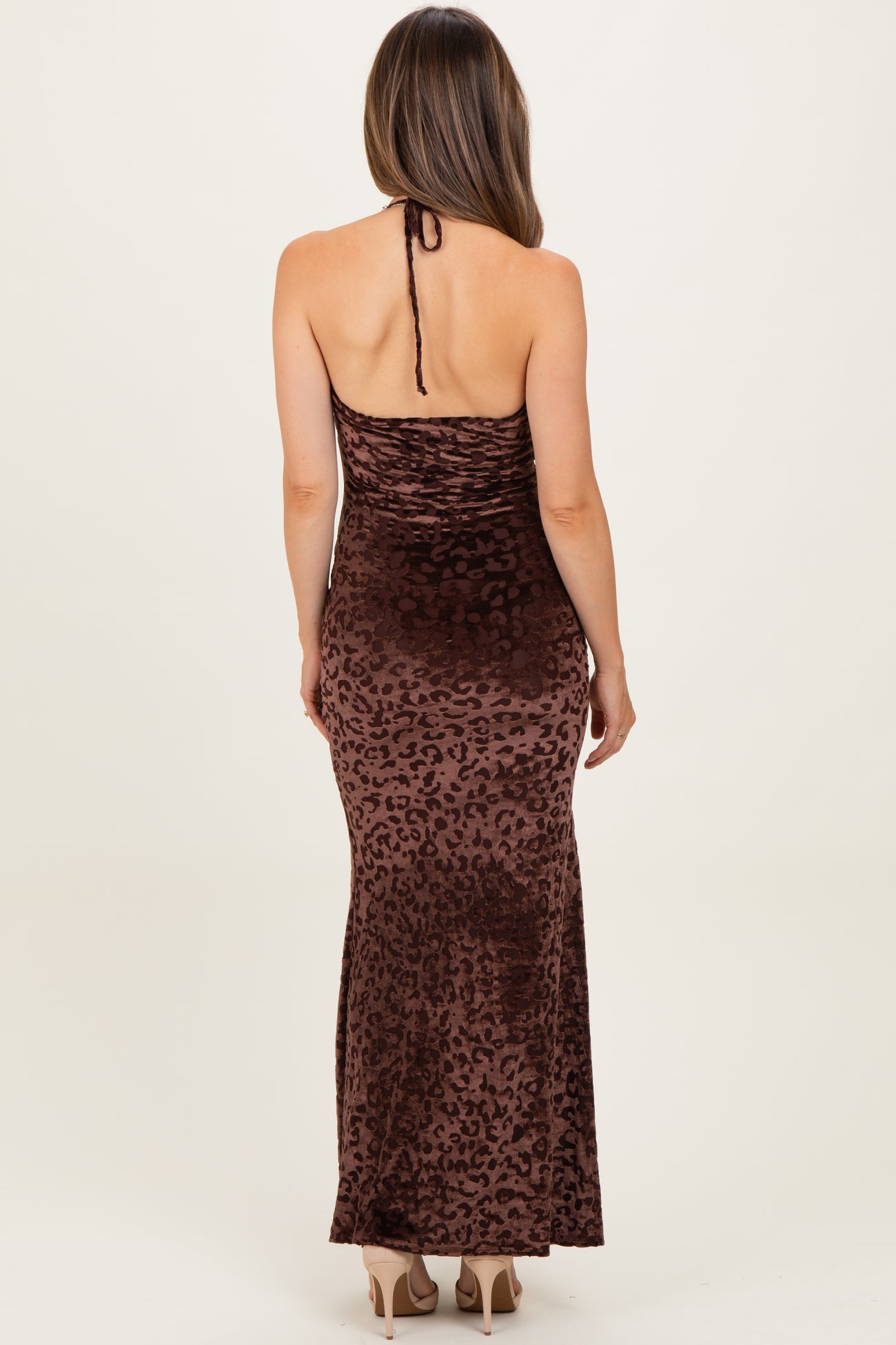 Brown Animal Print Halter Maternity Maxi Dress