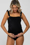 A solid hued maternity swimsuit featuring a v-neckline, ruched sides, adjustable straps and a front and back cutout.