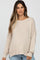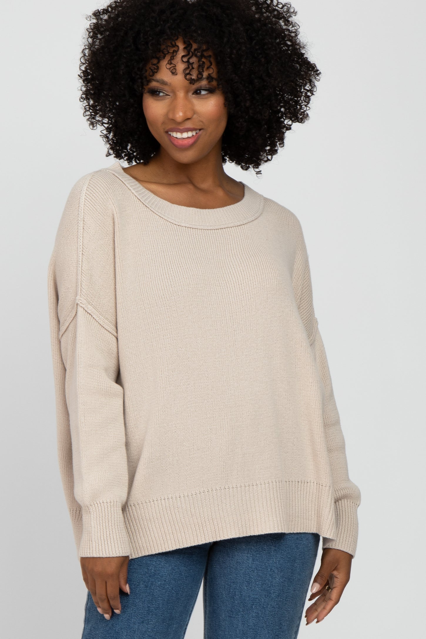 A maternity sweater featuring a crew neckline, ribbed trim, exposed seam detailing, long sleeves and side slits.