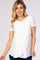 A solid hued short sleeve maternity nursing top featuring a wrap front accent and a rounded neckline.