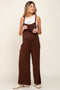 A solid sleeveless maternity jumpsuit featuring wide legs, a front pocket and side pockets.