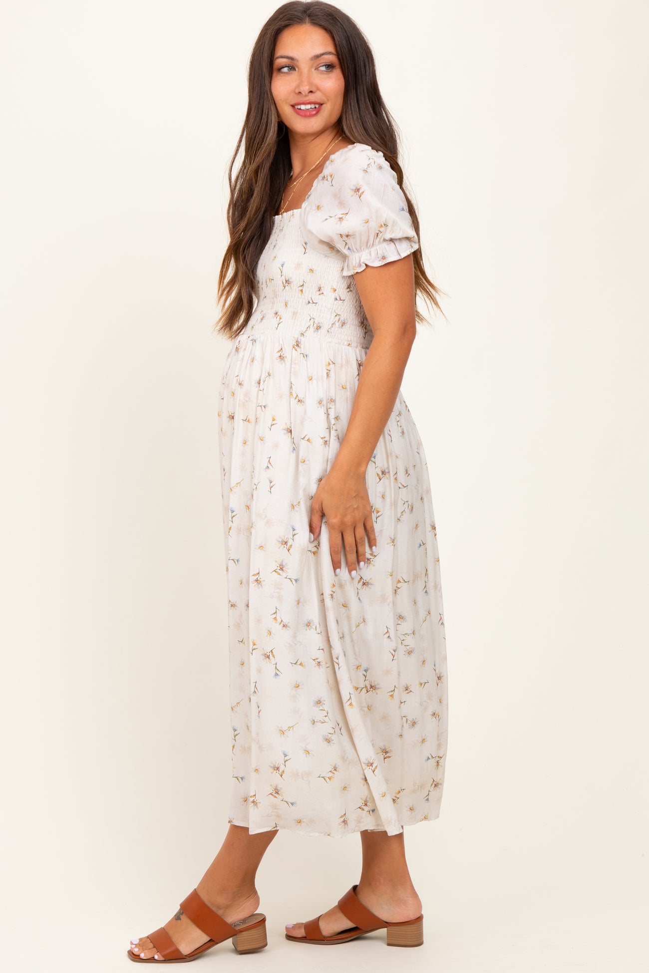Yellow Floral Printed Puff Sleeve Maternity Midi Dress