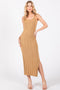 Details A striped ribbed knit midi dress featuring a rounded neckline and a belted tie at the waist. Content + Care
