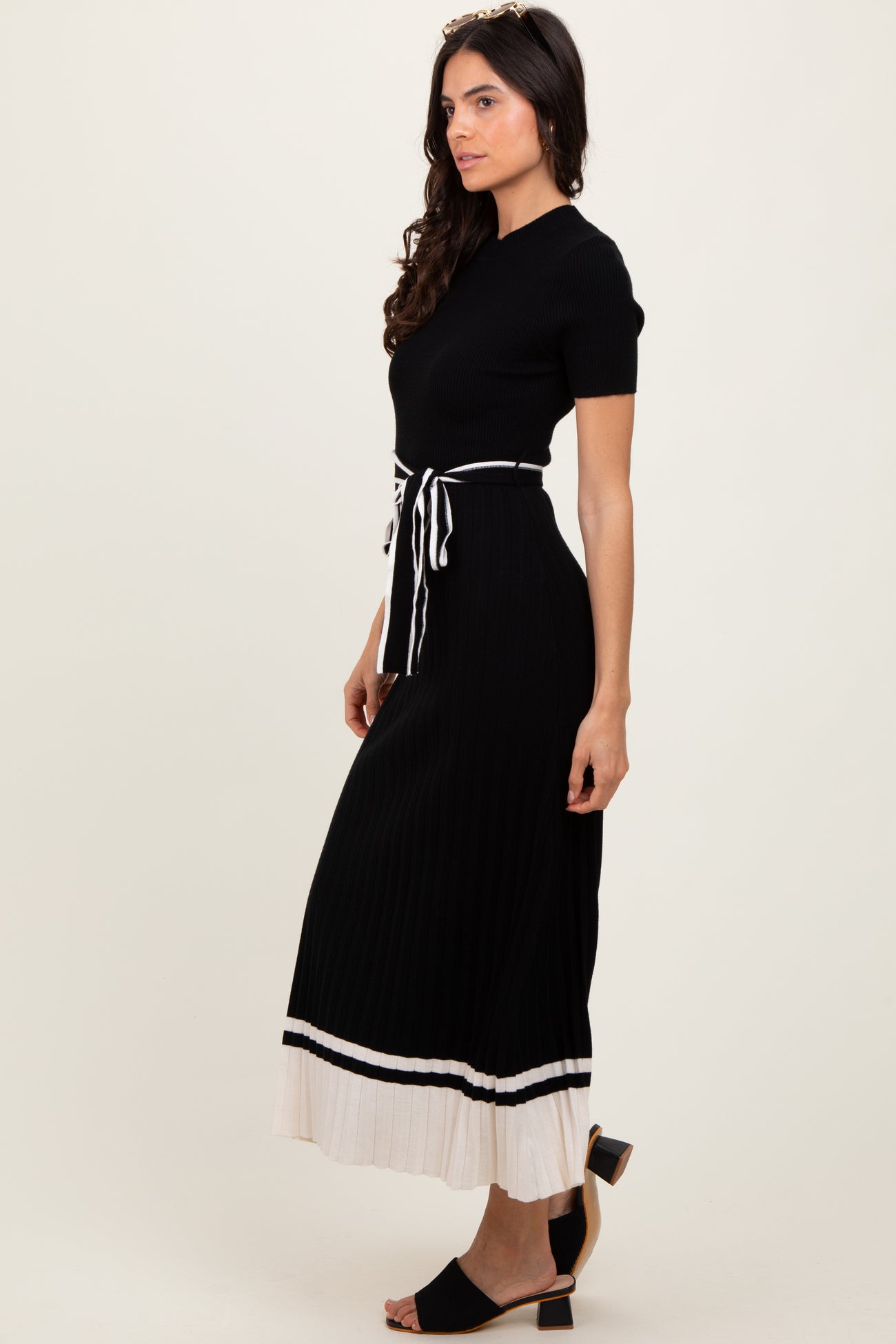 Elevate your wardrobe with this Black Ribbed Knit Pleated Midi Dress, the perfect fusion of comfort and style. Crafted from soft, stretch ribbed knit fabric, this dress features a flattering fitted bodice, short sleeves, and a chic mock neckline. The stylish pleated midi skirt flows gracefully to create effortless movement, while a contrasting white stripe and tie belt accentuate your waist for a refined silhouette. Finished with a unique white hem detail, this versatile dress is perfect for both casual outings and elegant occasions. Pair with sandals or heels for a timeless look you'll love.