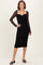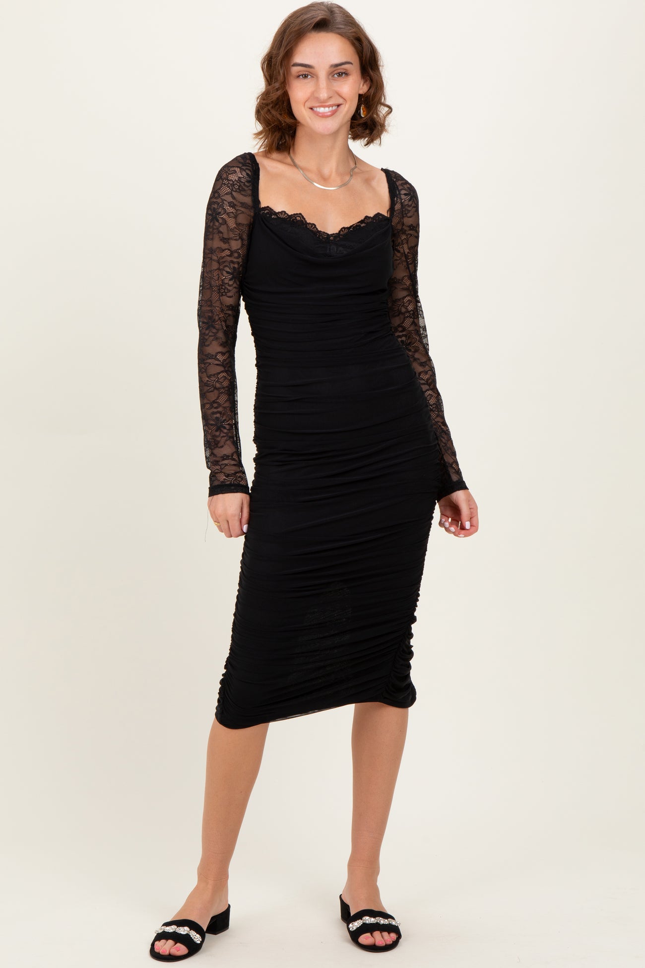 Black Ruched Lace Sleeve Midi Dress