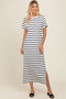Elevate your casual wardrobe with this Black Striped Side Slit Maxi Dress. Featuring classic horizontal white stripes on a sleek black backdrop, this dress offers timeless style and effortless elegance. The soft, breathable fabric ensures all-day comfort, while the side slit adds a hint of allure and freedom of movement. With short sleeves and a relaxed fit, it’s perfect for day-to-night wear. Pair it with sandals for a laid-back look or dress it up with heels and accessories for a chic evening vibe. Your go-to maxi for style, comfort, and versatility!