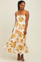Black Tropical Floral Front Cinched Tie Midi Dress