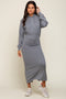 A solid satin maxi dress featuring a smocked elastic body with ruffle trim and adjustable cami straps.