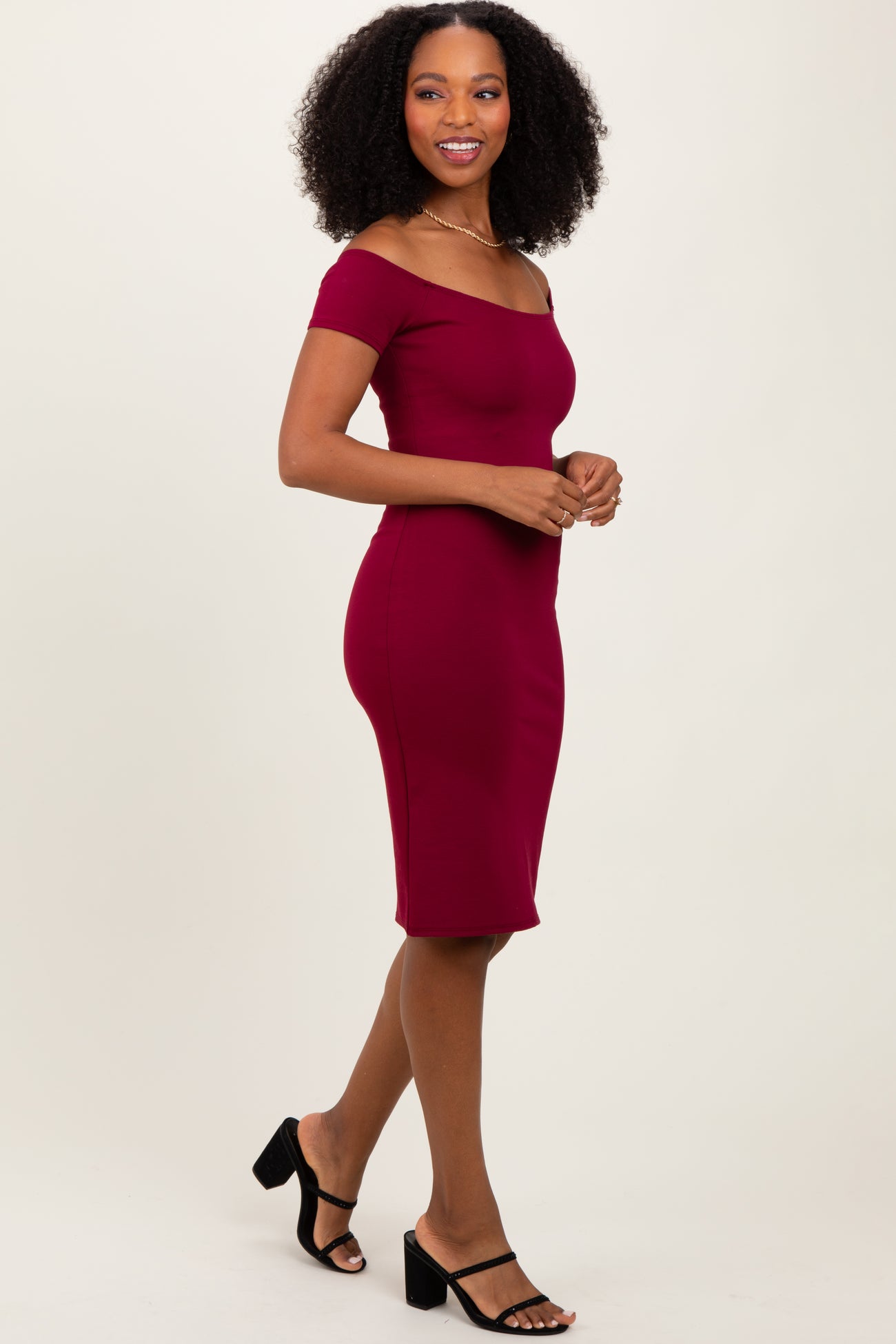 Step out in style with our Burgundy Off Shoulder Fitted Midi Dress. This sleek, figure-hugging dress features a flattering off-the-shoulder neckline that beautifully showcases your décolletage. Crafted from a comfortable, stretchy fabric, it effortlessly contours your silhouette for a polished look. The midi length adds a touch of sophistication, making it perfect for date nights, cocktail parties, or any special occasion. Pair with strappy heels and delicate accessories to complete your elegant ensemble. Elevate your wardrobe with this timeless piece that combines classic charm with modern flair.