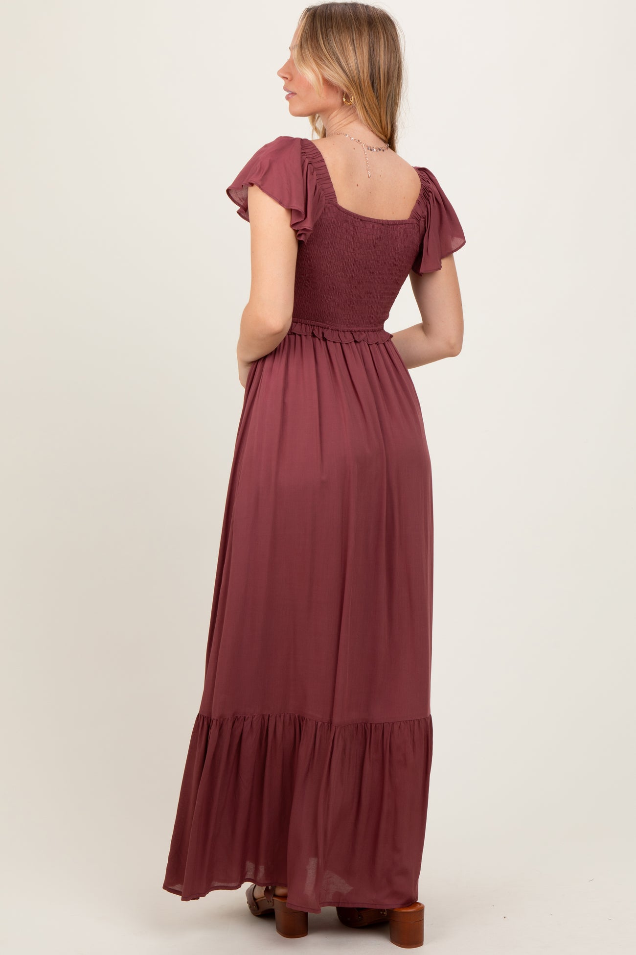 Elevate your wardrobe with this Burgundy Smocked Top Woven Maxi Dress, a perfect blend of comfort and style. Featuring a flattering smocked bodice with ruched detailing and adjustable drawstring ties, this dress beautifully accentuates your silhouette. The lightweight woven fabric flows effortlessly into a tiered maxi skirt, creating a graceful and feminine look. Delicate flutter sleeves and a subtle V-neckline add charming touches, making it ideal for casual outings, brunch dates, or summer events. Pair it with sandals or wedges for an effortlessly chic ensemble you'll love wearing season after season. Available in rich burgundy for a timeless appeal.