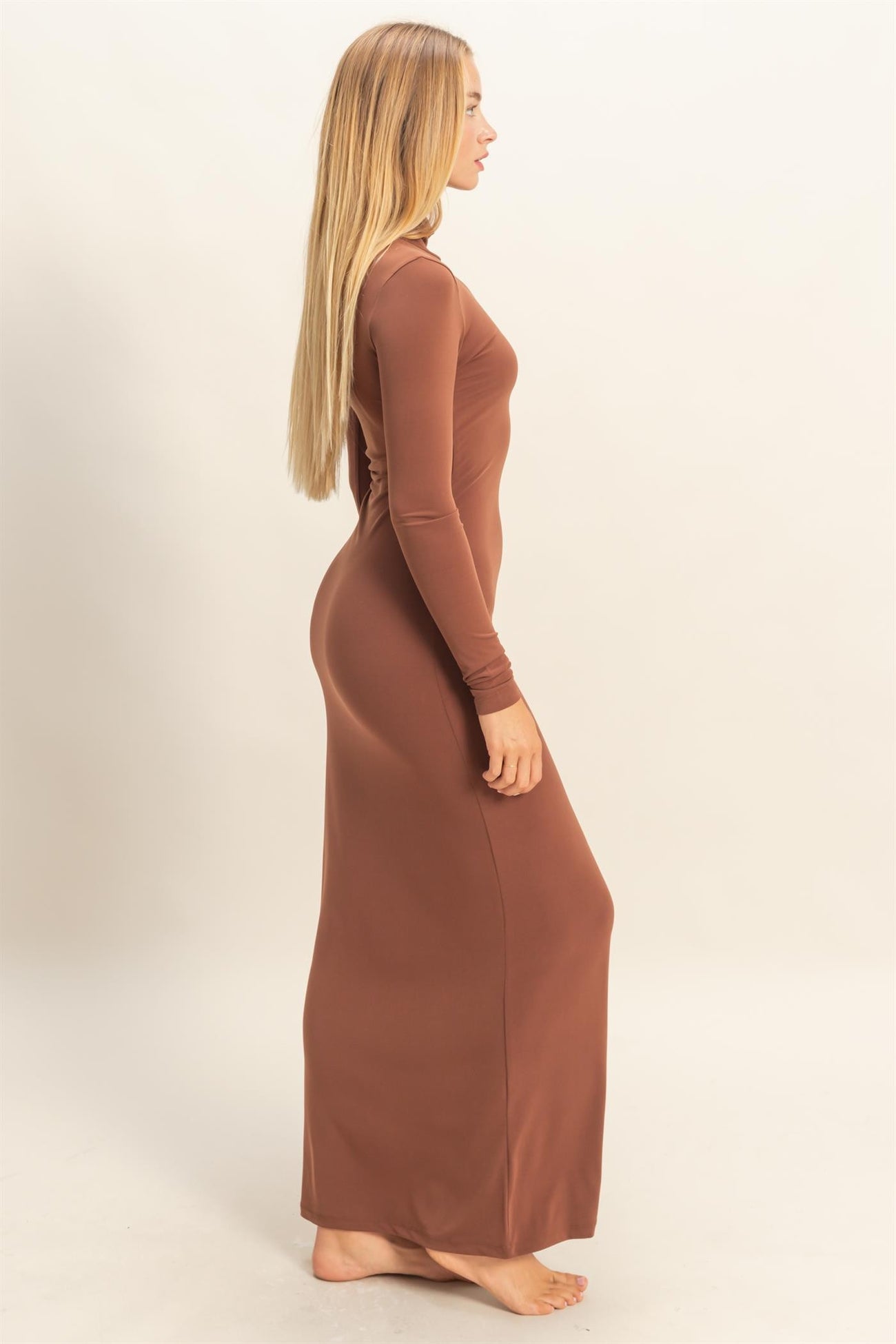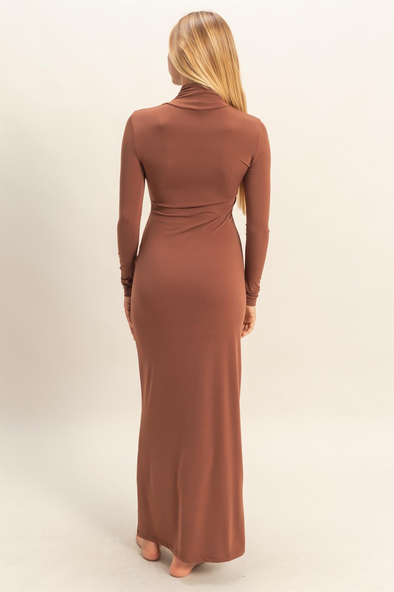 Elevate your wardrobe with our Camel Turtleneck Long Sleeve Maxi Dress. This sleek, form-fitting dress features a sophisticated turtleneck and full-length sleeves for a chic, modest look. Crafted from soft, stretchy fabric, it offers all-day comfort while gracefully hugging your silhouette. The warm camel tone adds a timeless, versatile touch, perfect for both casual outings and elegant occasions. Pair it with boots or heels to complete your effortlessly stylish ensemble. A must-have staple for every fashion-forward closet. Available in multiple sizes.