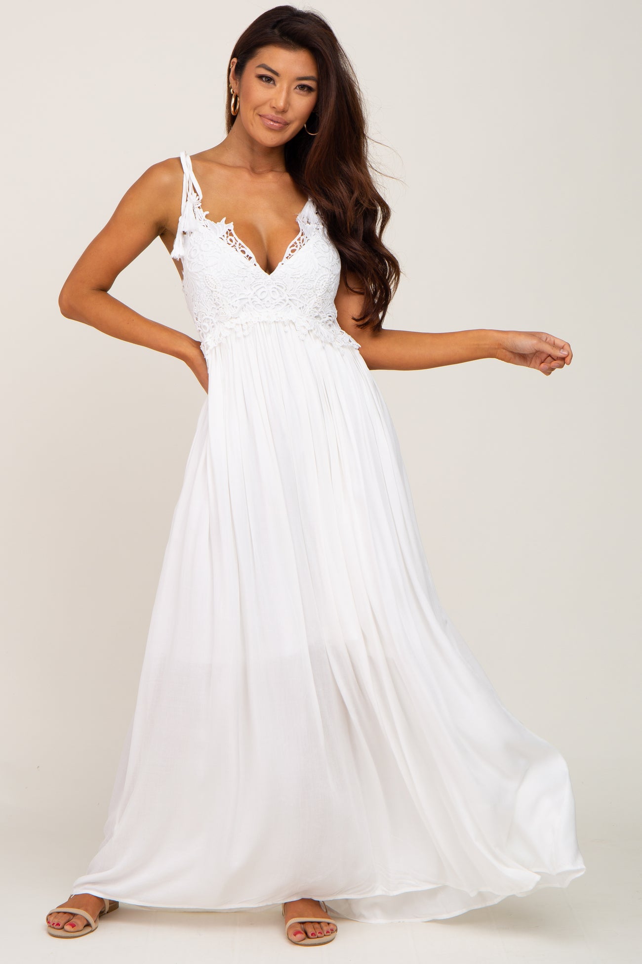 Details A solid hue maxi dress featuring a crochet lace top, a smocked back, and adjustable tassel trim shoulder ties. Dress is partially lined. Content + Care