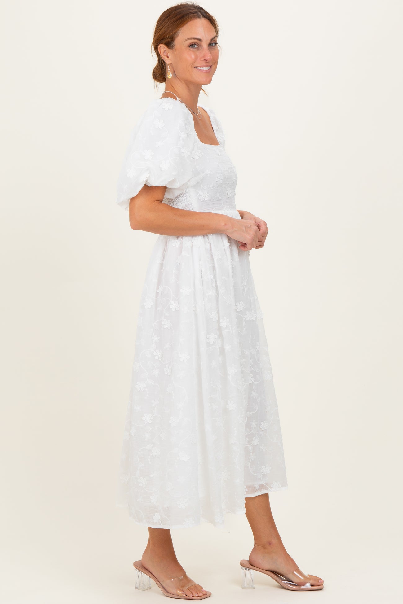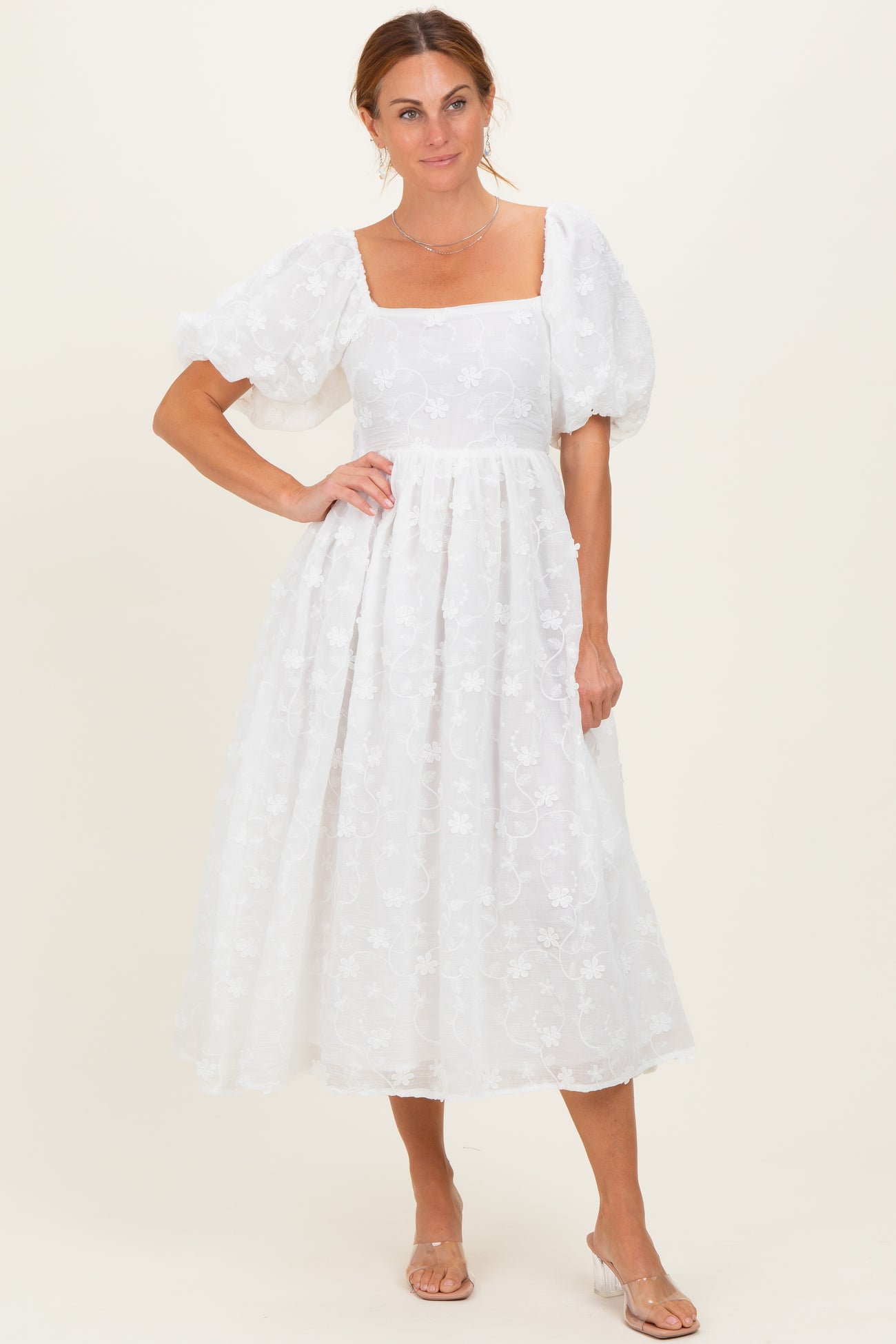 Ivory Embroidered Floral Puff Sleeve Midi Dress