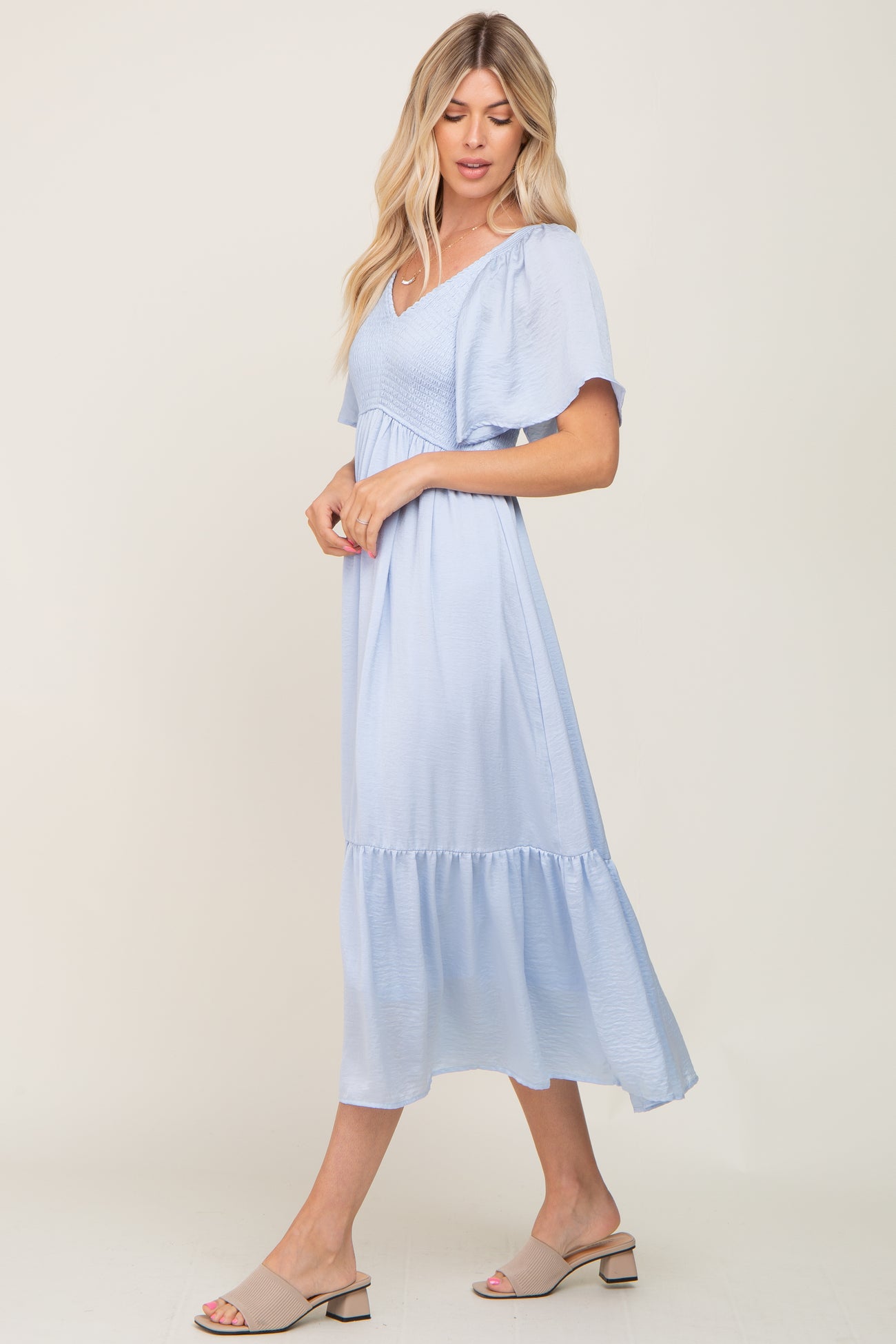 Light Blue Satin Smocked Midi Dress