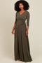 A solid hued fitted maxi dress featuring long sleeves and a v-neckline.