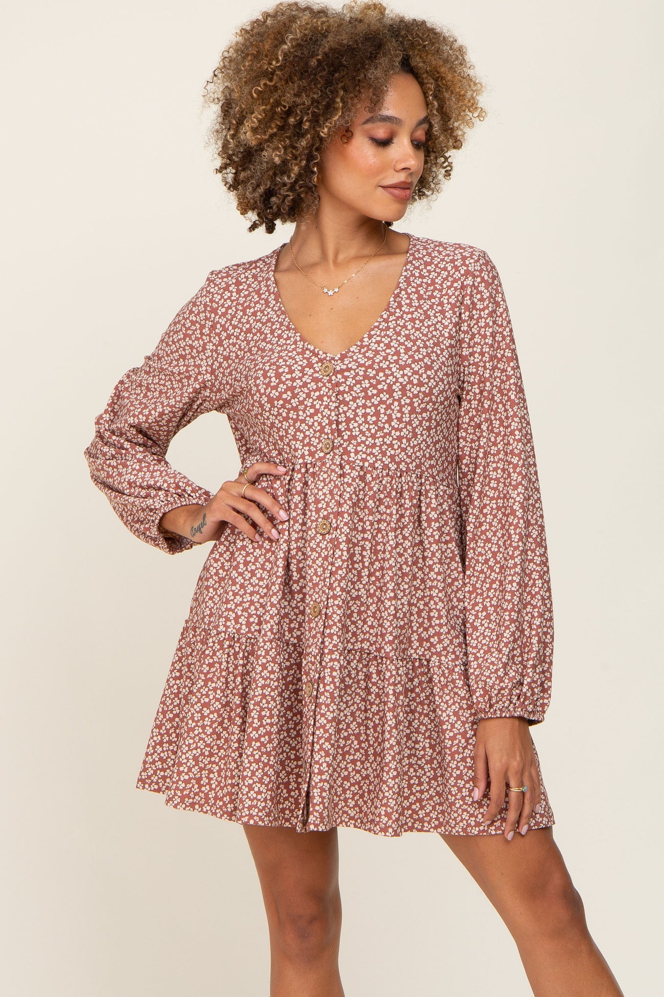 Details A floral tiered dress featuring long sleeves, a button down front and a v-neckline. Content + Care