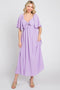 A floral print chiffon, metallic striped midi dress featuring a v-neckline, short flutter sleeves, a ruffle tiered skirt and double lined at the skirt and bust.