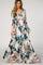 A floral printed maxi dress featuring a draped v-neckline, 3/4 sleeves, and a sash tie.