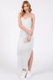 A ribbed maxi dress featuring long sleeves, a side slit and a rounded neckline.