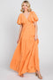 A floral print maxi featuring a squared neckline, short puff sleeves, a smocked back, side pockets, and a gathered hem. Dress is fully lined.