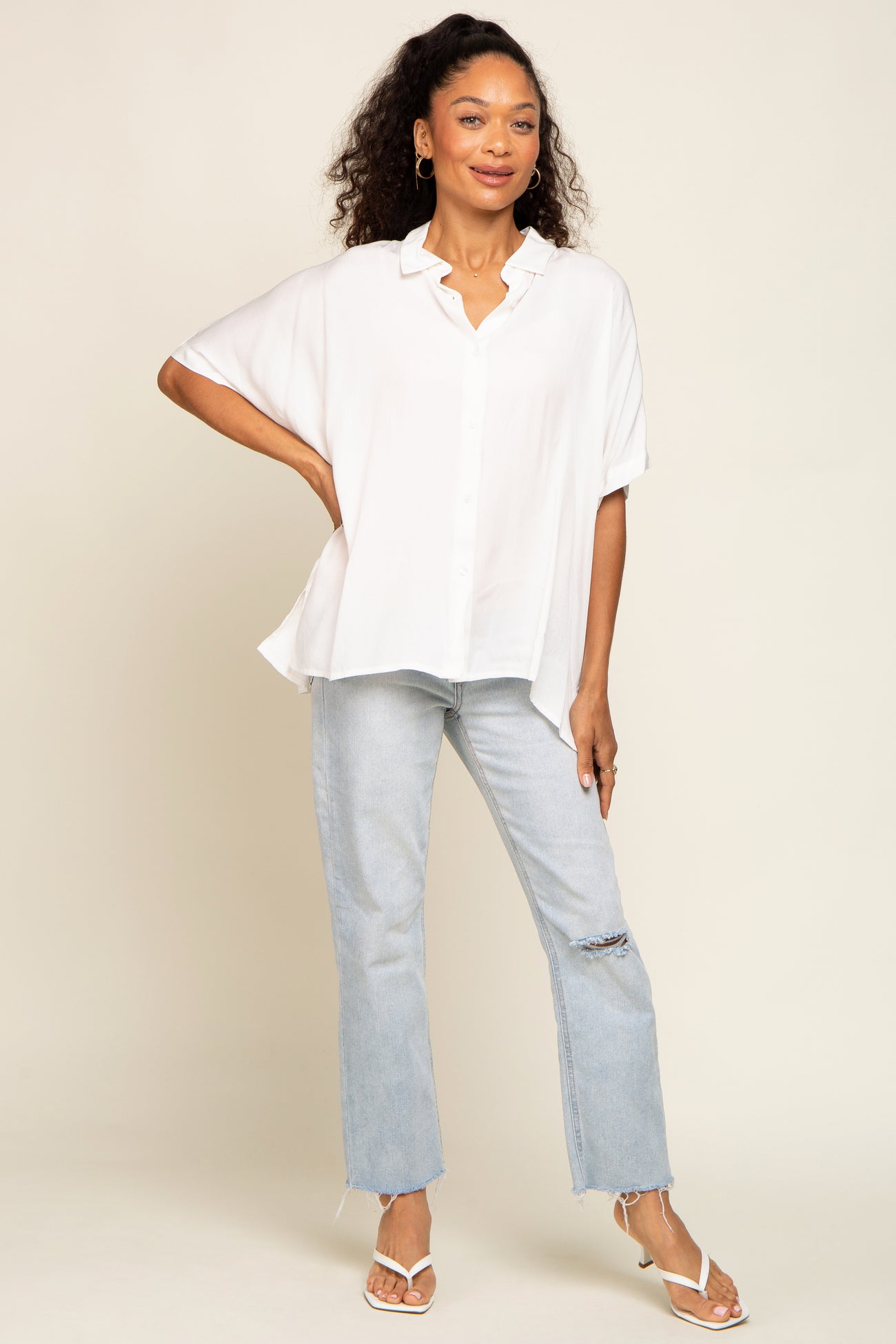 A solid hue button up top. Features a collar, front functioning buttons, short dolman sleeves, and side slits at the hem.