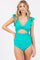 A one piece swimsuit featuring flutter sleeves, a cutout knotted front, a back cutout, a back closure and removable padding at the bust.